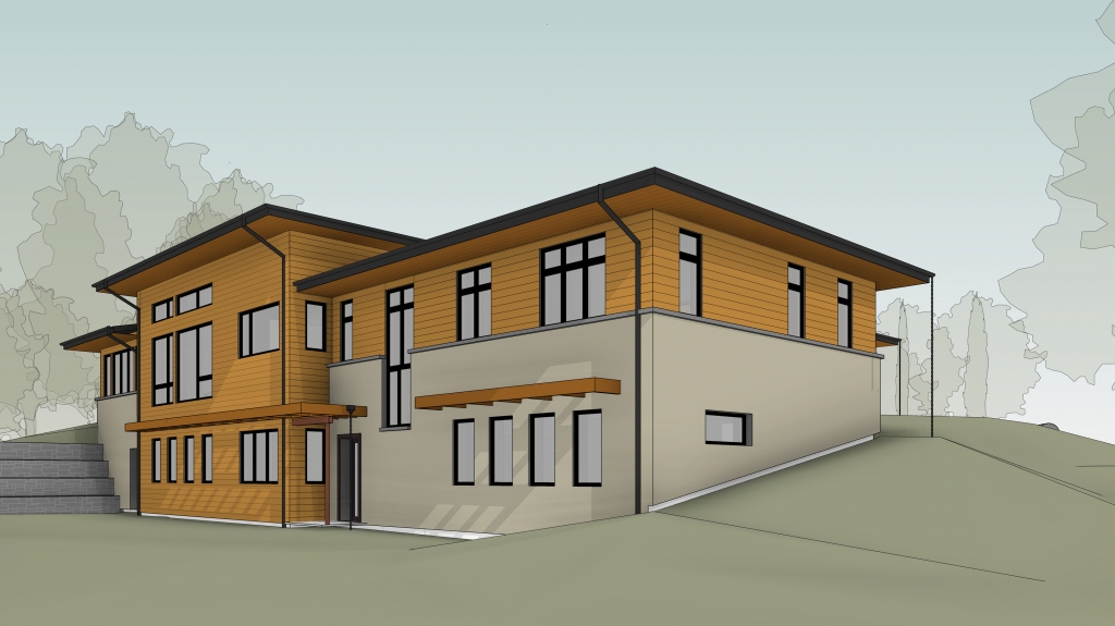 It’s been a little while since we introduced this beautiful new build, sitting along a tributary of the Credit River and home to an active couple nearing retirement. The home that previously stood on the lot was impressive, albeit dated and oddly oriented. The 1970’s Viceroy Cabin was suffering from mould and structural damage, and stood facing away from the lovely river that snakes by the property. Our clients decided to throw in the towel on the whole building and start fresh, calling on us to build a new 2000 sq.ft. bungalow with a walk-out basement on the south-facing river side. This spacious home will have everything our clients will need and more: the first floor will be home to the couple, and the basement will acts as a separate 2 bedroom suite for their oldest son and his family. The home’s design is fresh, impressive, and unique to our clients’ needs. Let’s take a look at the floor plan! Upstairs, a double garage connects to a mud room adjacent to the front entry. The master bedroom sits at the far east corner, with windows facing south and east. An ensuite bathroom and large walk-in closet complete the dream bedroom. Stairs to the basement divide the home’s private bedroom from the more public areas. The stairwell is designed with a tall window that perfectly frames the river’s picturesque footbridge seen from the property. A small window seat on the landing is the perfect place to curl up with a book on a rainy day. Beyond the stairs, a hallway opens up to the huge open concept Great Room. The kitchen (deemed one of the most important rooms in the house) has three zones: the cooktop with counters on each side, the island for food prep and quick meals and the sink area for easy clean up. A huge walk in pantry stands behind the kitchen, with lots more counter space and floor to ceiling shelving to house the wife’s extensive cookbook collection. An extra special touch is the pantry’s window that looks towards the river. Past the kitchen sits the dining and living room with a near 14’ ceiling, huge windows on the south and north and a central stone-clad fireplace on the west end wall. An office is tucked up into the north-east corner which will make working from home a breeze, if need be. Behind the fireplace, a large sun room sits on the western end of the home, with an extra eating and sitting area, for late night sights of the river and the setting sun. The sun room is also home to a wood stove for cool evenings. The basement has an entrance from both the first floor and a private entrance from the outdoors, so the son and his family can have their privacy when needed. The basement has three large private rooms (to be made into bedrooms, baby’s rooms, offices, etc.), a bathroom, and a large living area. The home’s aesthetic will be clean, warm, and tranquil. Using Frank Lloyd Wright’s organic and Usonian architecture of the 1920s and 30s as inspiration, the home’s materials will be carefully chosen to reflect the landscape’s palette. Inside, the home will be modern and dramatic, with differing ceiling heights, delicate crown moulding, and our clients’ hand-crafted mission furniture. Next comes demolishing the old home and constructing the new one. We can’t wait to see this rural home take shape!Credit River Valley’s Wright-like StyleGo To Project Page