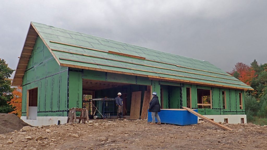 On the lower level, the foundation walls are built with insulated concrete forms (ICF), and there are six inches of insulation below the slab. On the main floor above, the wall assembly uses Zip panels with the seams taped and rolled – a very important task for ensuring the Zip system works as designed. The space between the studs is filled with mineral wool insulation, and we put three inches of EPS insulation on the exterior. Windows and doors are high-performance, triple-pane units by Eurovinyl.