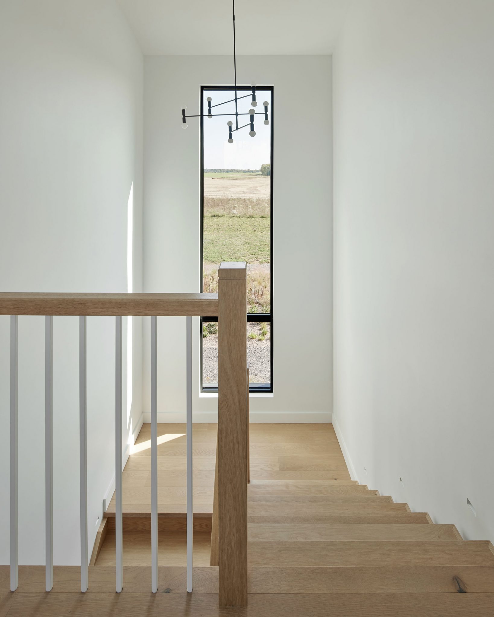 The land is flat and open, with low forests in the distance. Views are long and stretch far across the surrounding meadows. The shape of the home takes cues from surrounding agricultural references and captures the feeling of being planted on the ground looking across to the horizon.