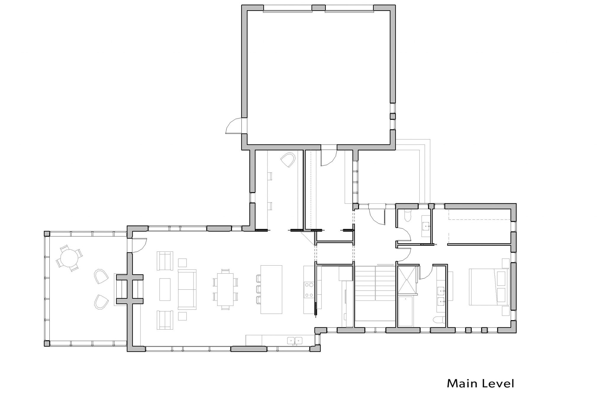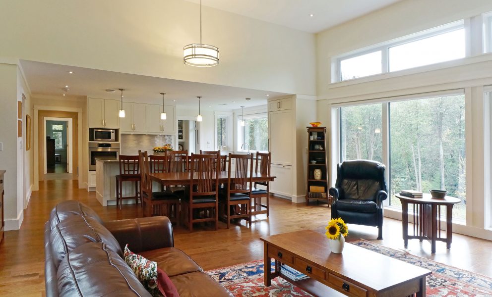 The new building is organic with compressed spaces leading to expanded ones, and an integrated relationship with the surrounding landscape. Each floor is 2,000 sq.ft. with a generous walk-out from the finished lower level. Every room has a gorgeous view of the forest and river.