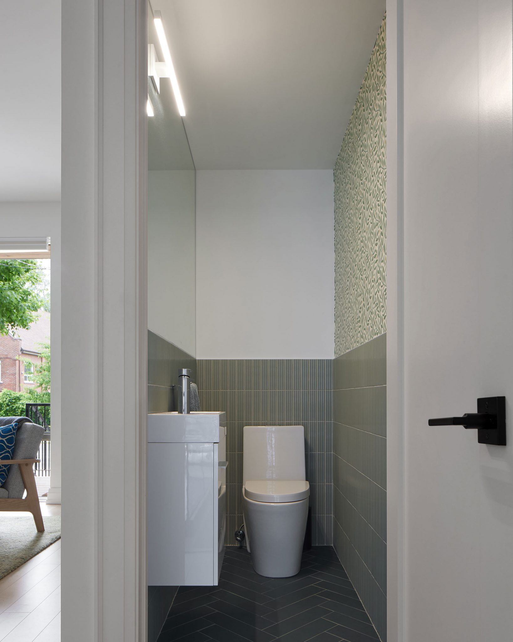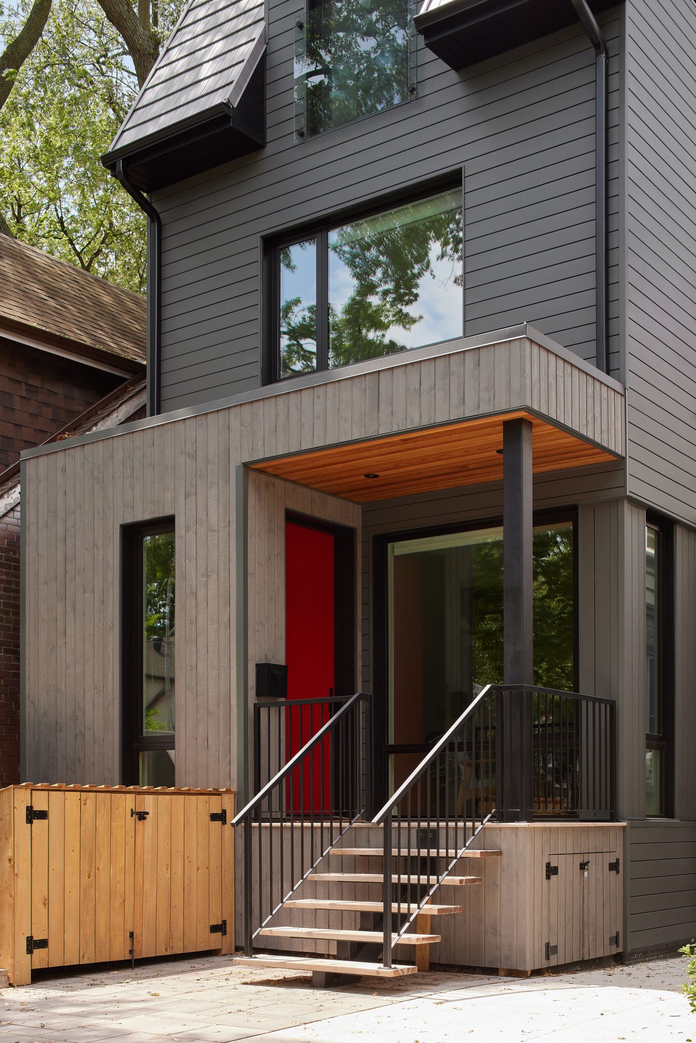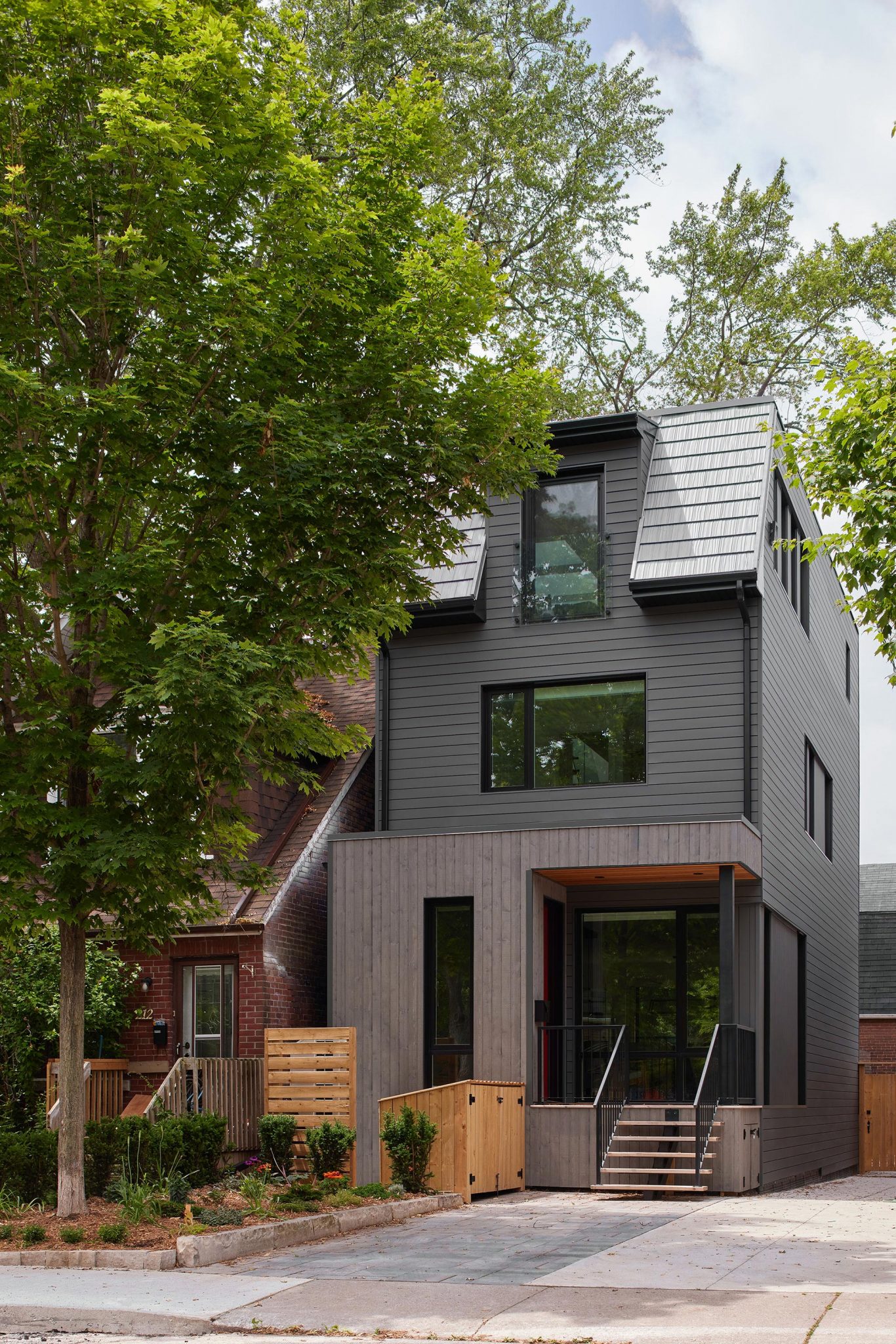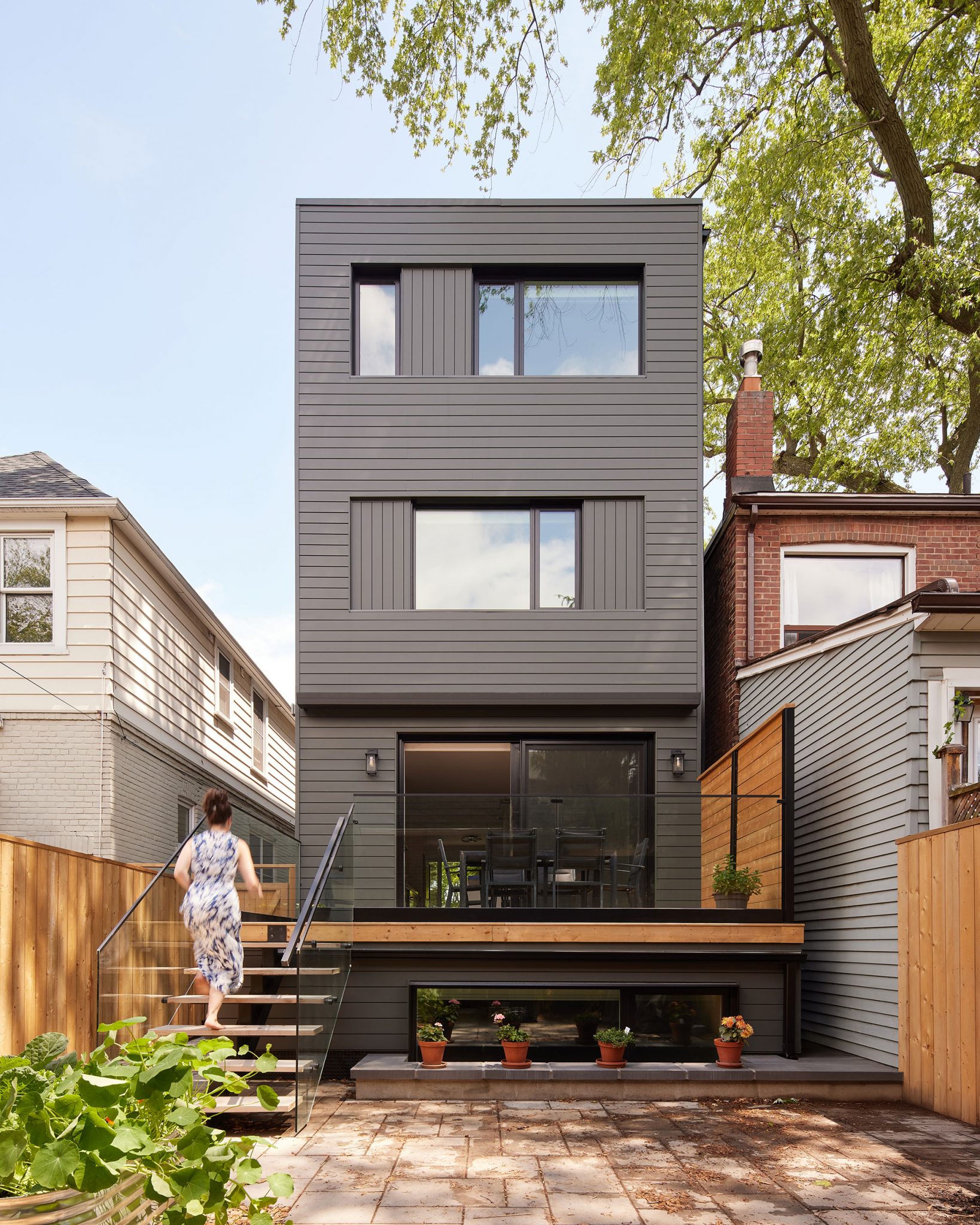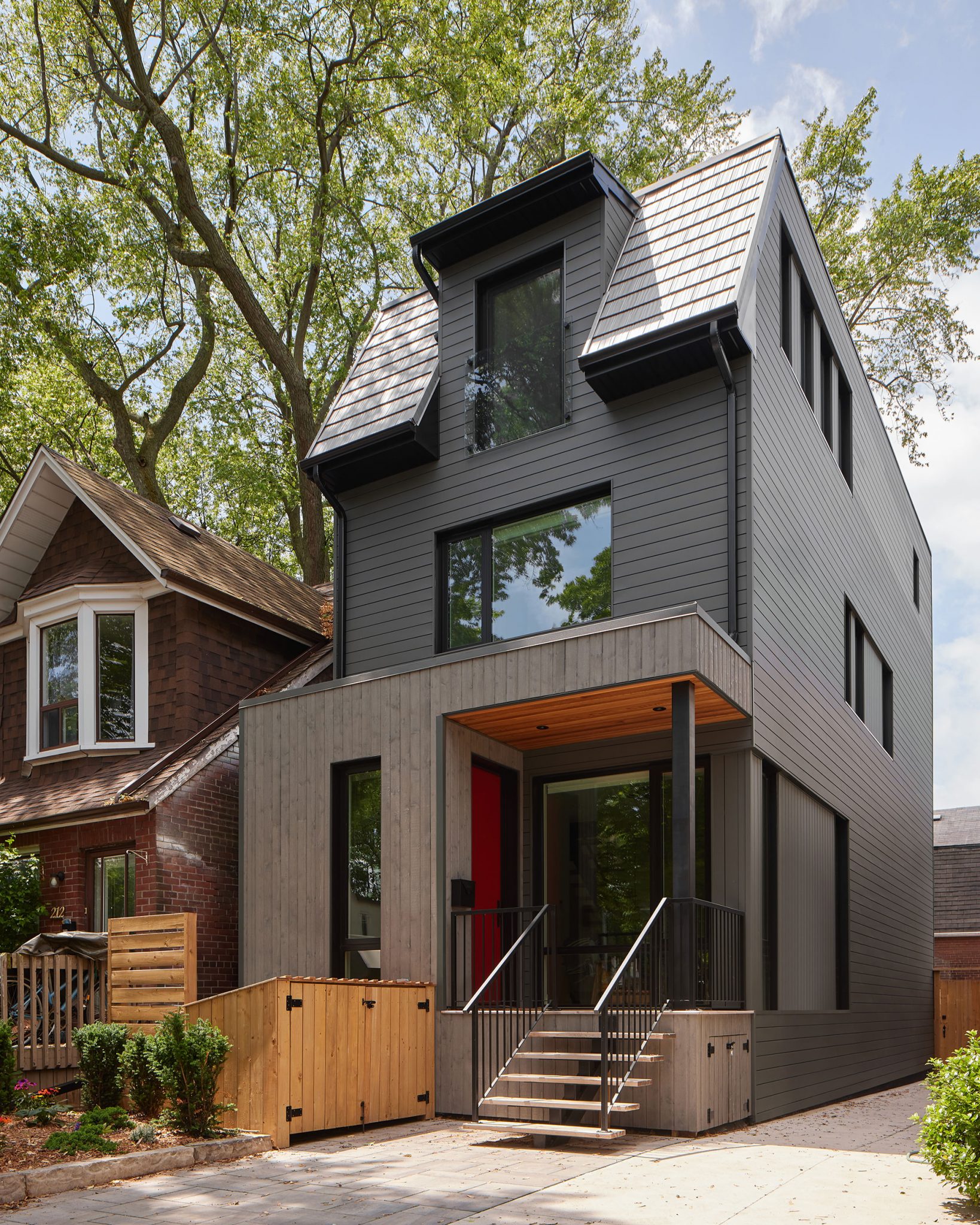 On the exteriors, a soft grey palette marries modernity with traditional forms, reinterpreting local vernacular elements such as horizontal siding, dormers, steeply pitched roofs, and shingles, further blending into the aesthetics of the street.
