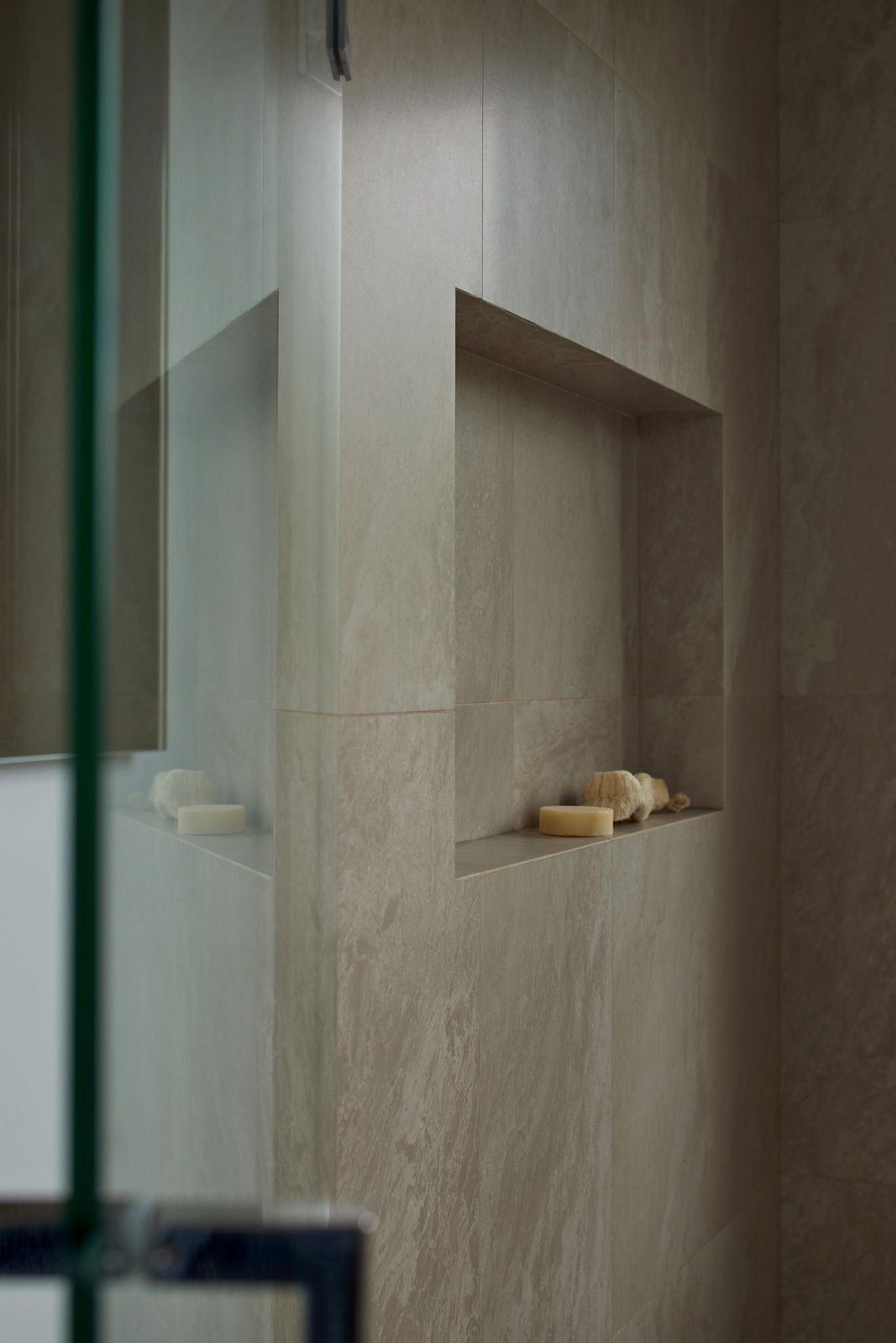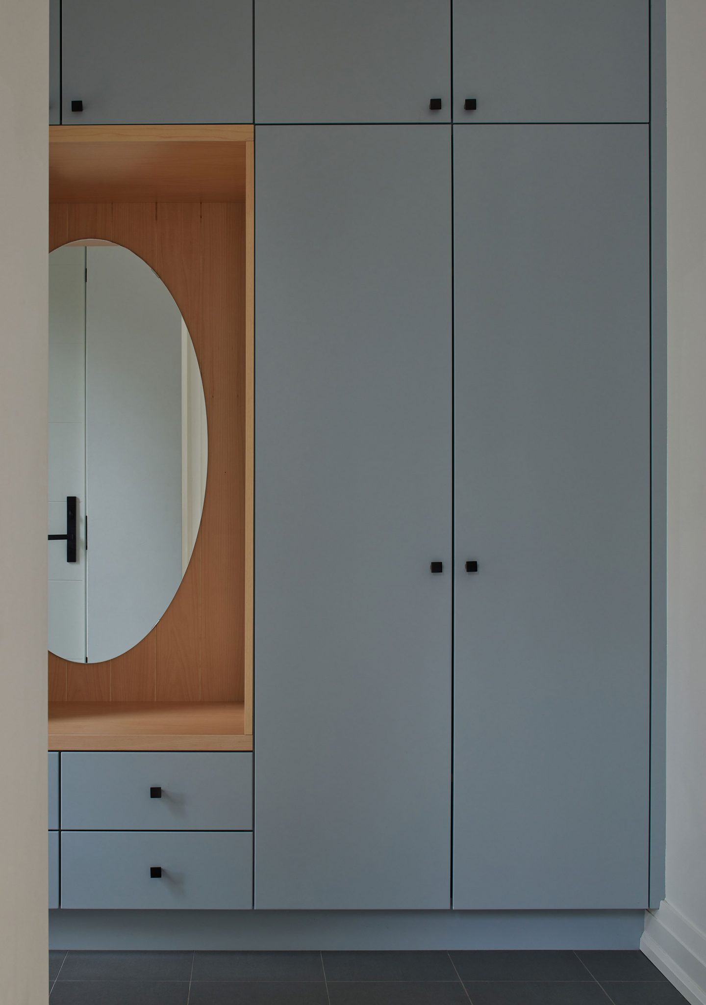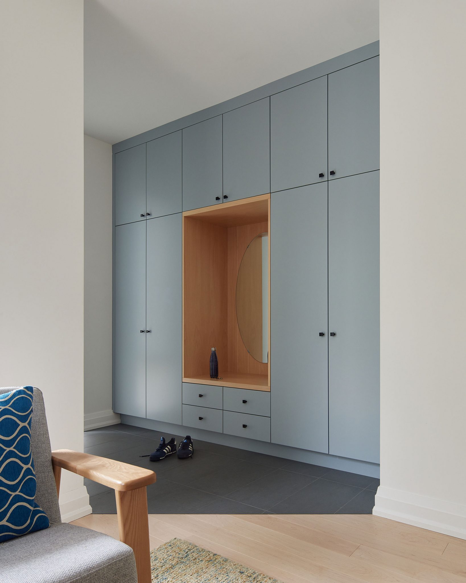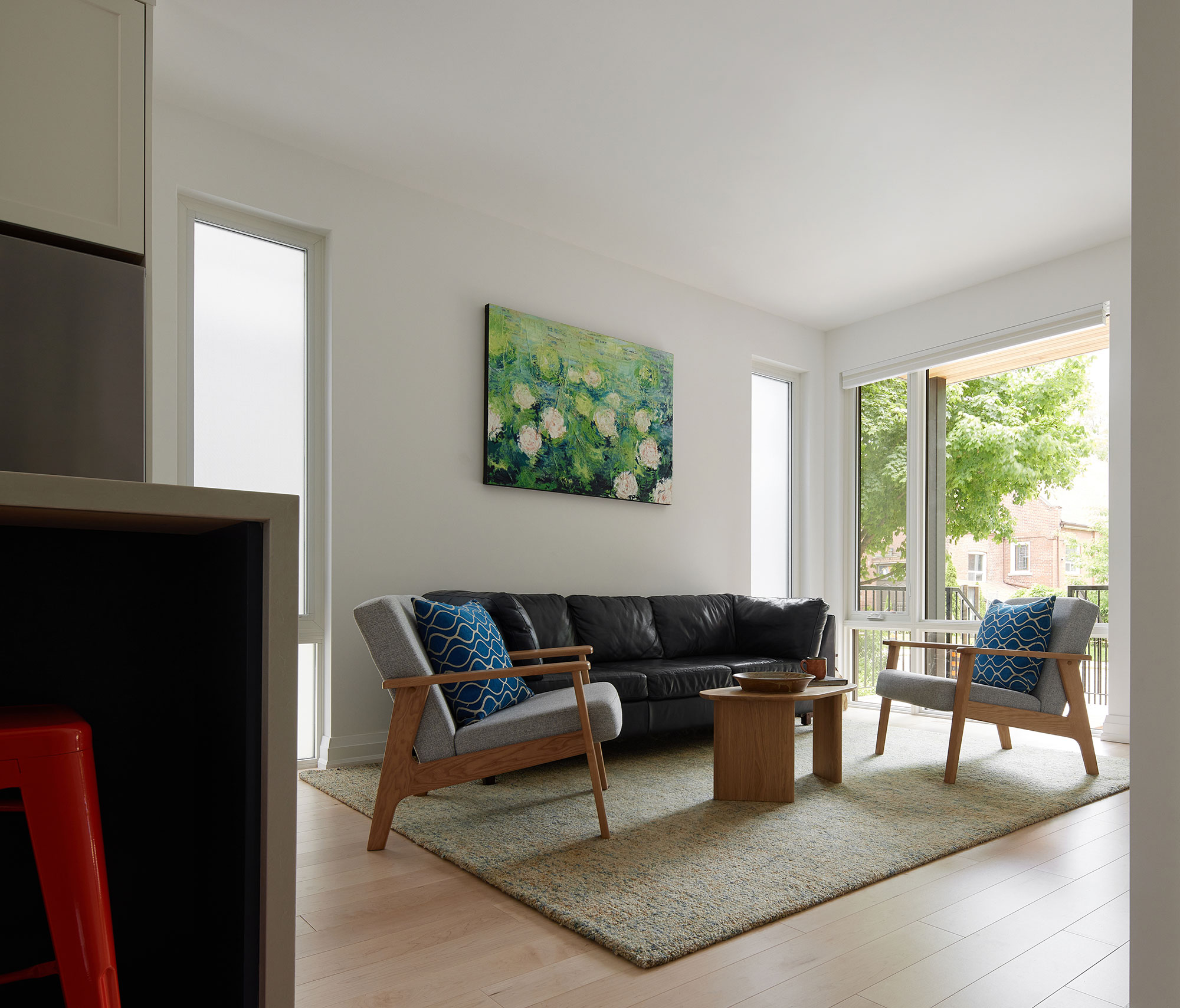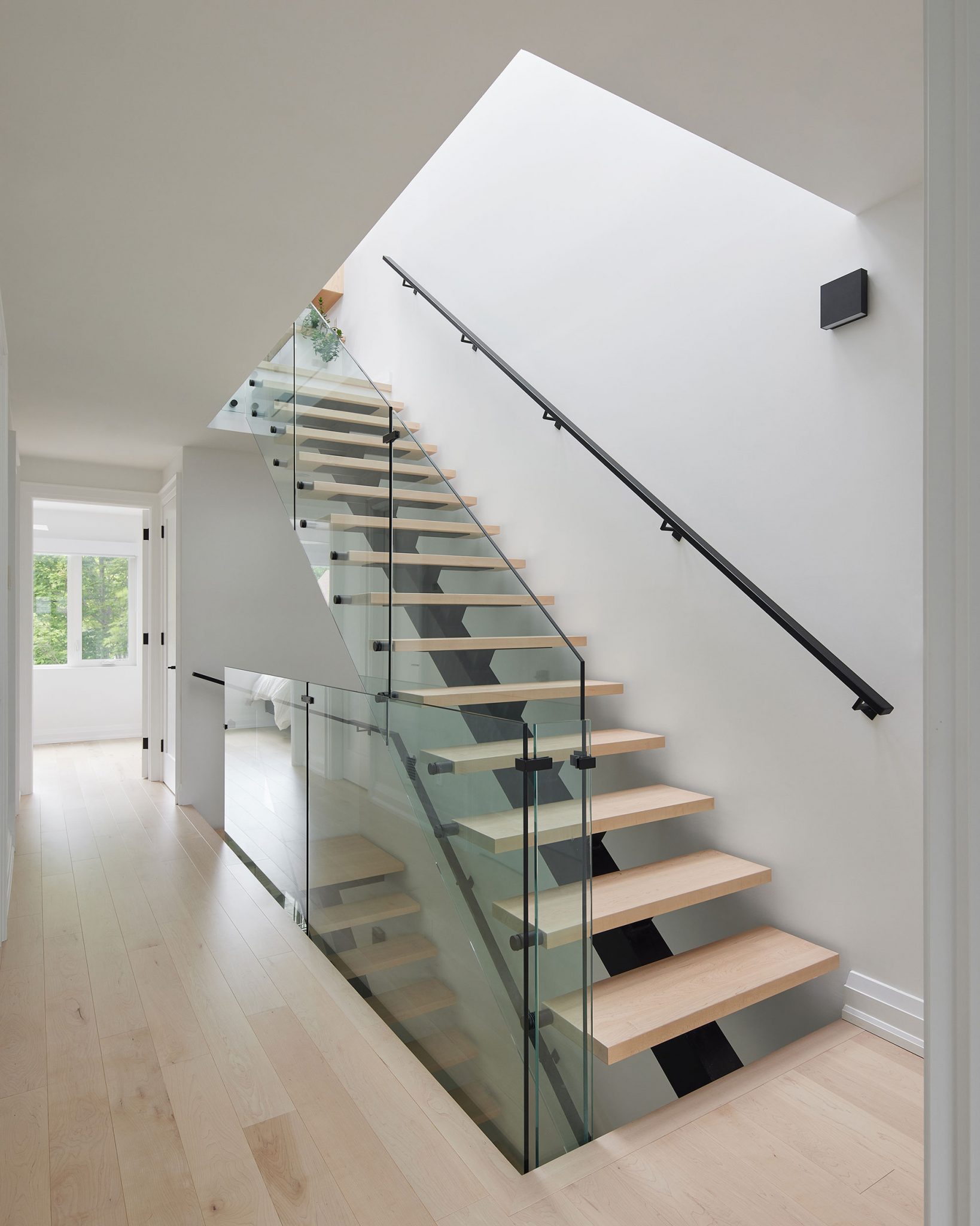 On the exteriors, a soft grey palette marries modernity with traditional forms, reinterpreting local vernacular elements such as horizontal siding, dormers, steeply pitched roofs, and shingles, further blending into the aesthetics of the street.
