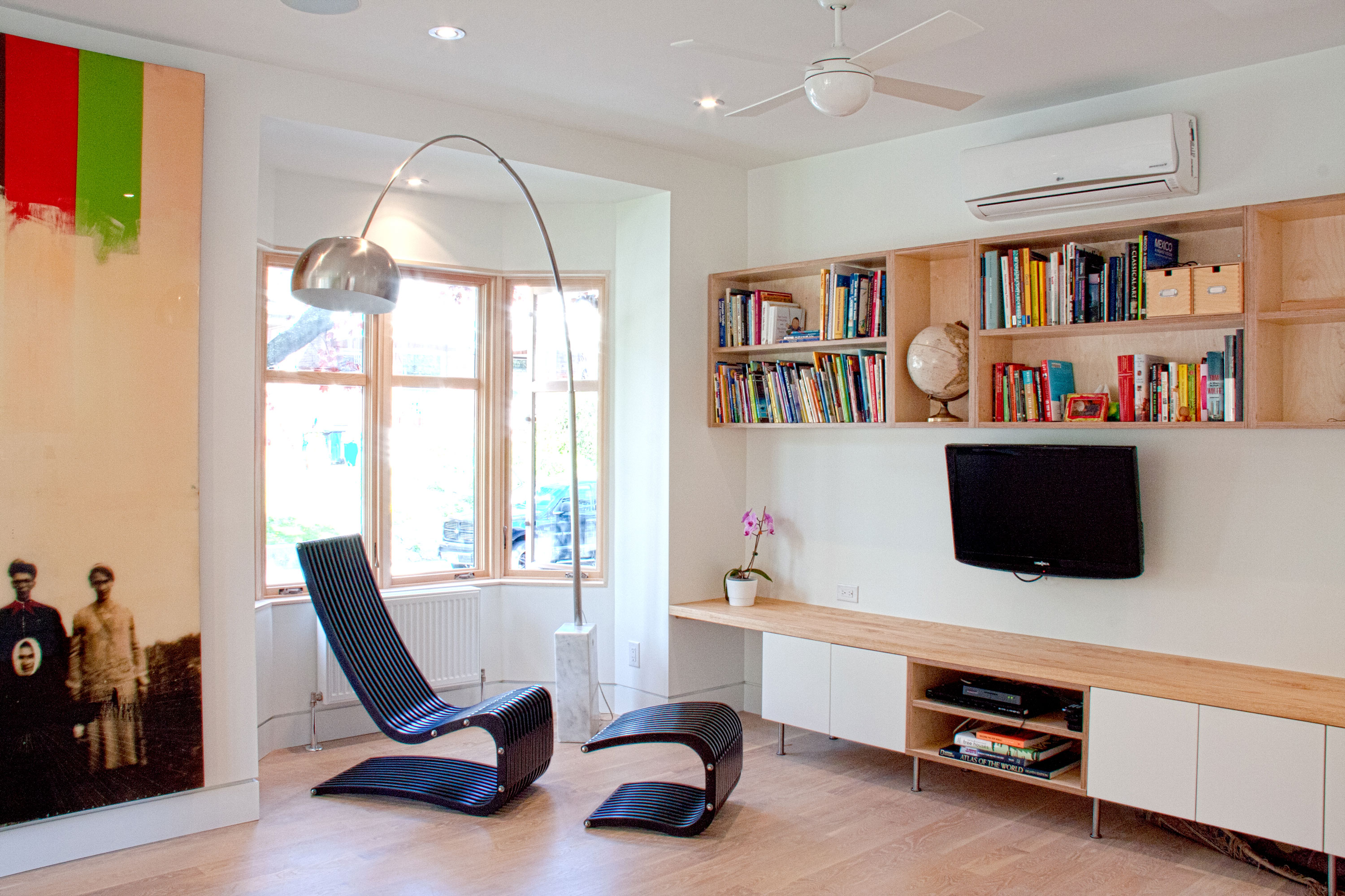 Besides a clever design to optimize the family’s living space, this renovation also included major structural repairs, upgrades to all systems, a drastic increase of thermal performance, and fully updated interiors. The insulation value was more than quadrupled by applying closed-cell, water-based, spray foam to the inside face of the roof and load-bearing brick structure, also serving to make the house air tight. A high efficiency boiler provides heat for new compact radiators as well as for domestic hot water.