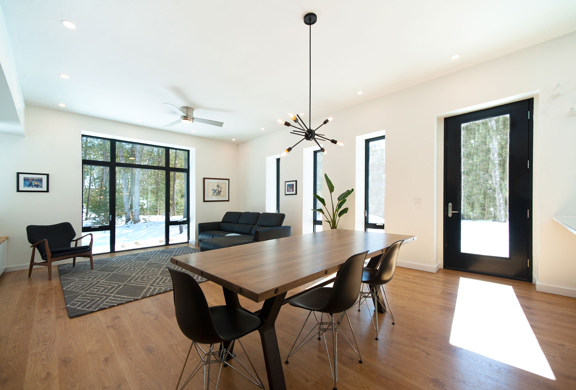 This rural new build, located near Kawartha Highlands Provincial Park just north of Peterborough, was built under odd and unfortunate circumstances. The clients’ old home on the same property was hit by lightning and burnt down. Thankfully no one was hurt, but the home was completely destroyed. However, this unlikely circumstance led to an amazing opportunity: Building an entirely custom, Net Zero energy house.