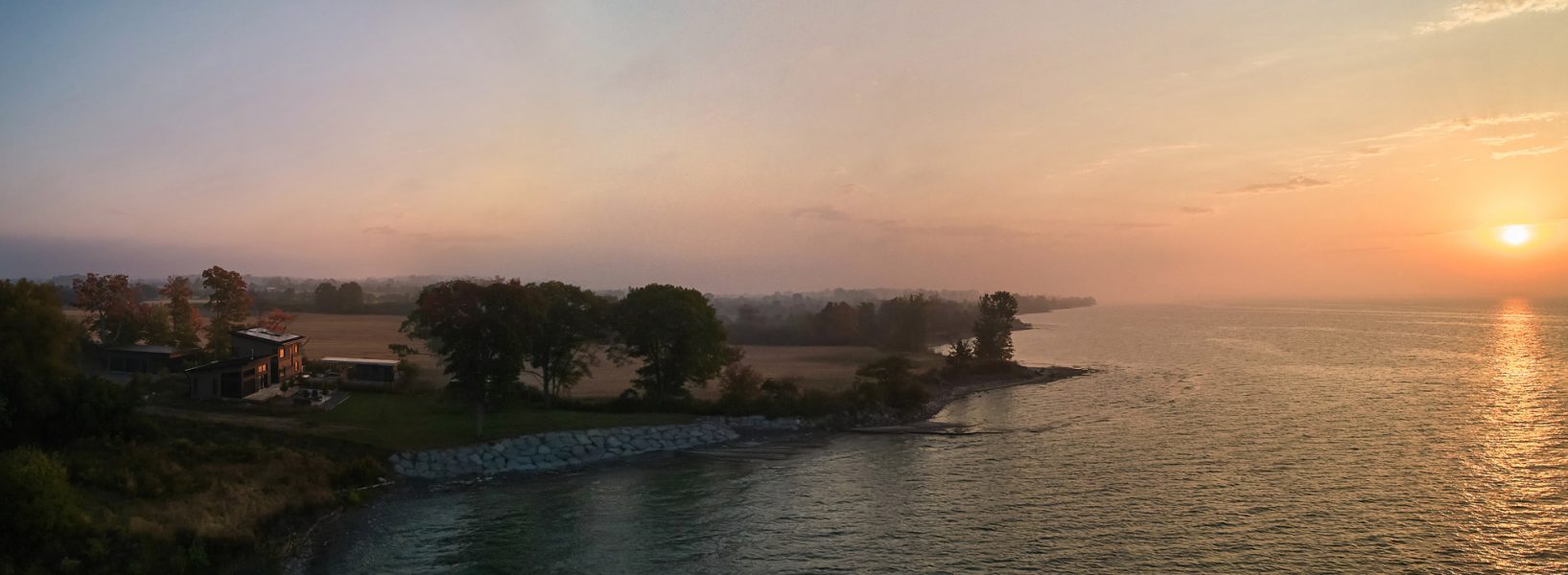 La Pointe is a lakeside vacation property in Prince Edward County with sweeping views over Lake Ontario. The long narrow property has lush fields, mature trees, and lake frontage.