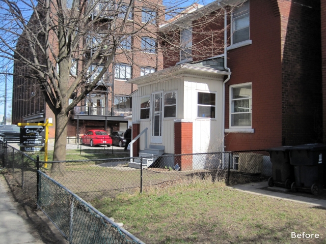 The previous home had many qualities that they valued. It was close to parks, schools, and shops on Roncesvalles Avenue. It was walking distance to the Solares office, and though the home lacked a backyard, a spacious yard wrapped around the front and east sides of the house. A large tree sits in the front, and a detached garage is located on the eastern edge of the property line.