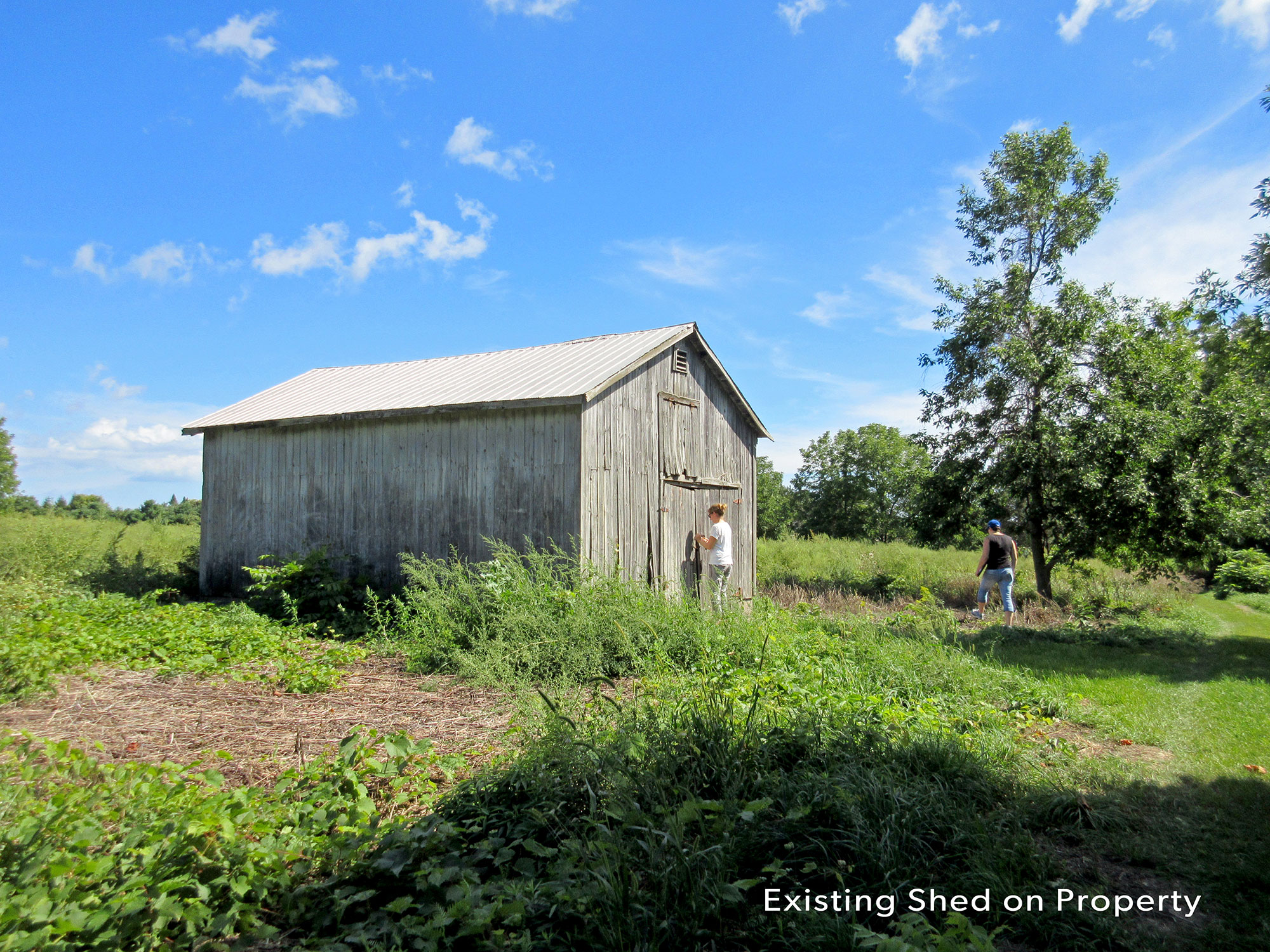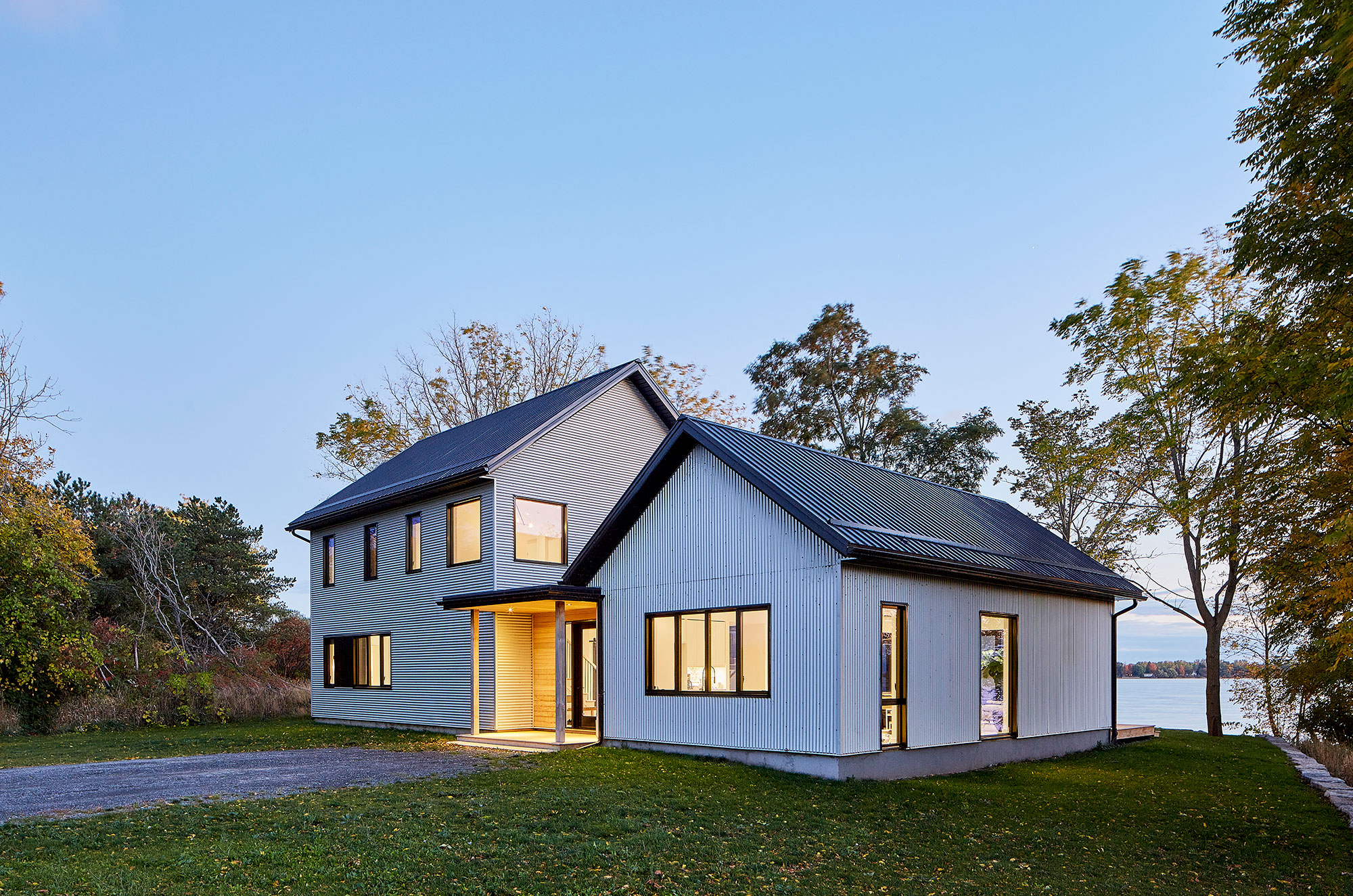 The two-storey dwelling successfully marries the traditional farmhouse with the contemporary home. It is shrouded in a small cluster of trees. Two distinct gable-topped volumes speak the language of rural Canadian farmland, but the wood-clad entryway separating them and their orientation perpendicular to one another are fresh and modern. The defining palette of light corrugated steel siding is punctuated by the black of the accent panels, roof, and window frames.